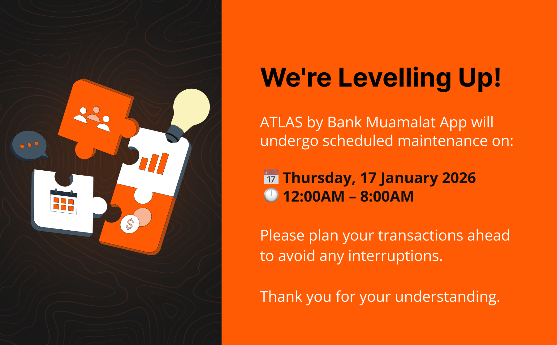 To access, subscribe or utilise certain products and services of ATLAS Digital Banking, you will be required to provide your personal and/or financial information (“information”) to Bank Muamalat Malaysia Berhad (“the Bank”). The detail and types of information required will depend on the specific product or service. Such information may include your personal information such as your full name, identification number, contact address, contact number and/or your financial information such as your income, assets, liabilities, credit card information, etc. The information required is necessary for identification purposes and to effectively and efficiently provide you with ATLAS’s products or services.